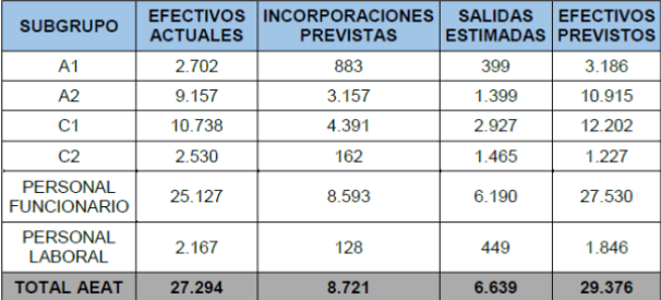 Destaca la voluntad de la AEAT de querer seguir aumentando el número de efectivos, pasando a 29.376 efectivos, es decir, 2.082 efectivos netos más que a 31 de diciembre de 2023. Este incremento se va a producir con la entrada neta exclusivamente de personal funcionario, ya que el personal laboral neto se pretende disminuir.